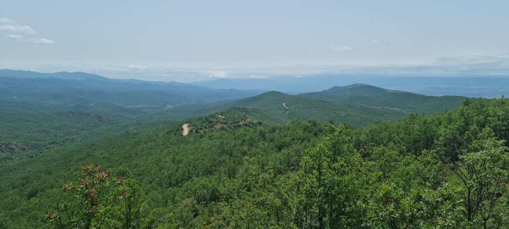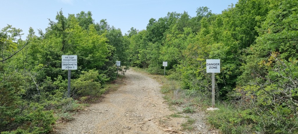 Next day I left Shtip by 9 am, following a route suggested by the Komoot app I use for trekking and touring. Weather was gorgeous, then I was off the asphalt and on a very rough gravel trail up the hill, so steep I probably couldn’t have biked it at the start of this trip. Suddenly there was a sign saying “Danger”.