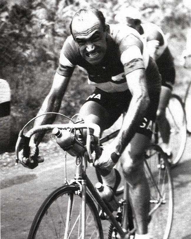 In the 1956 Giro d’Italia, stage 12, Fiorenzo Magni famously broke his left clavicle and still managed to finish second overall. At the hospital he refused a plaster cast and refused to abandon the Giro in the year of his announced retirement. Magni continued the race with his shoulder wrapped in an elastic bandage. To compensate for his inability to apply force with his left arm, he raced while holding a piece of rubber inner tube attached to his handlebar between his teeth for extra leverage. Since his injury prevented him from effectively braking and steering with his left hand, Magni crashed again after hitting a ditch by the road during a descent on stage 16. He fell on his already broken clavicle, breaking his humerus, after which he passed out from the pain. They put him in an ambulance, but when Magni regained his senses and realized that he was being taken to the hospital he screamed and told the driver to stop. Magni took his bike and was able to finish the stage in the peloton, which had waited for him. Of the evening that followed Magni said “I had no idea of how serious my condition was, I just knew that I was in a lot of pain but I didn’t want to have X-rays that evening”. Just four stages later, the infamous 20th stage of Giro ’56 dawned where Luxembourg’s Charyl Gaul would execute his legendary mountain stage victory in Trento, haunted by snow and ice over the Costalunga, Rolle, Brocon and Bondone climbs. That day 60 people abandoned the race, and Gaul went from 16 minutes behind to winning the 1956 Giro; Magni, despite his injuries, placed second, 3 minutes and 27 seconds behind Gaul.