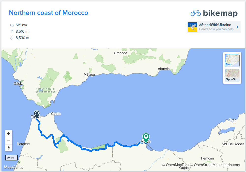This trip started as an idea of biking from Tangier in Morocco to Tunis in Tunisia. In early May 2022 I took the train to southern Spain and the boat to Tangier, and the next day I started biking. I knew the border between Morocco and Algeria had been closed since 1994, so the initial plan was to bike to the border, then back to the Spanish enclave of Melilla, then a ferry back to Almería in Spain, then a ferry down to the westernmost city of Ghazaouet in Algeria, next bike back to the other side of the border, and continue east.